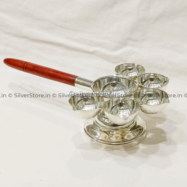 Silver panchaarti/ silver 5 diya aarti with wooden handle - 925 silver